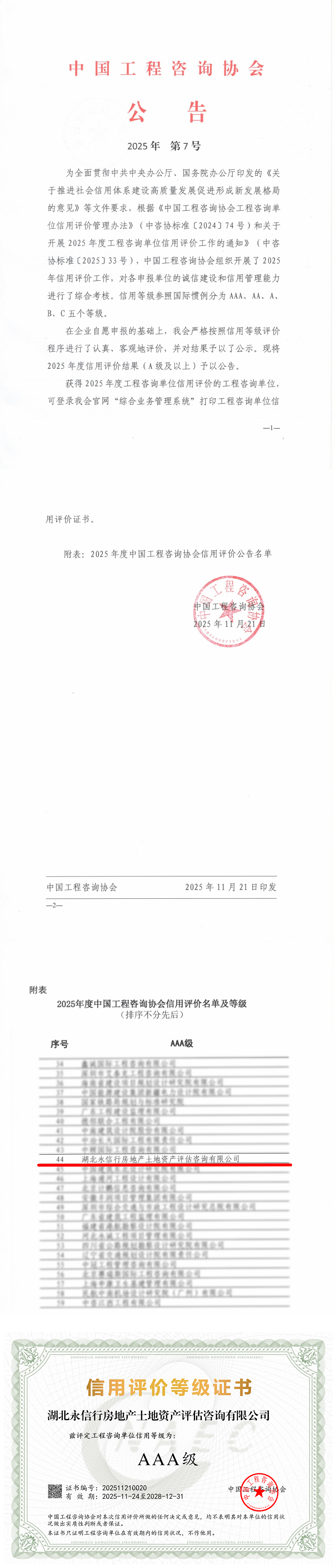 金秋传捷报,诚信获认可!近期,在中国工程咨询协会组织的2024年度工程咨询单位信用评价工作中,永信行凭借扎实的诚信建设、规范的信用管理与优质的专业服务,经自主申报、严格评审及公示等环节筛选,成功荣获2025年工程咨询单位信用评价AAA级(最高信用级别)。