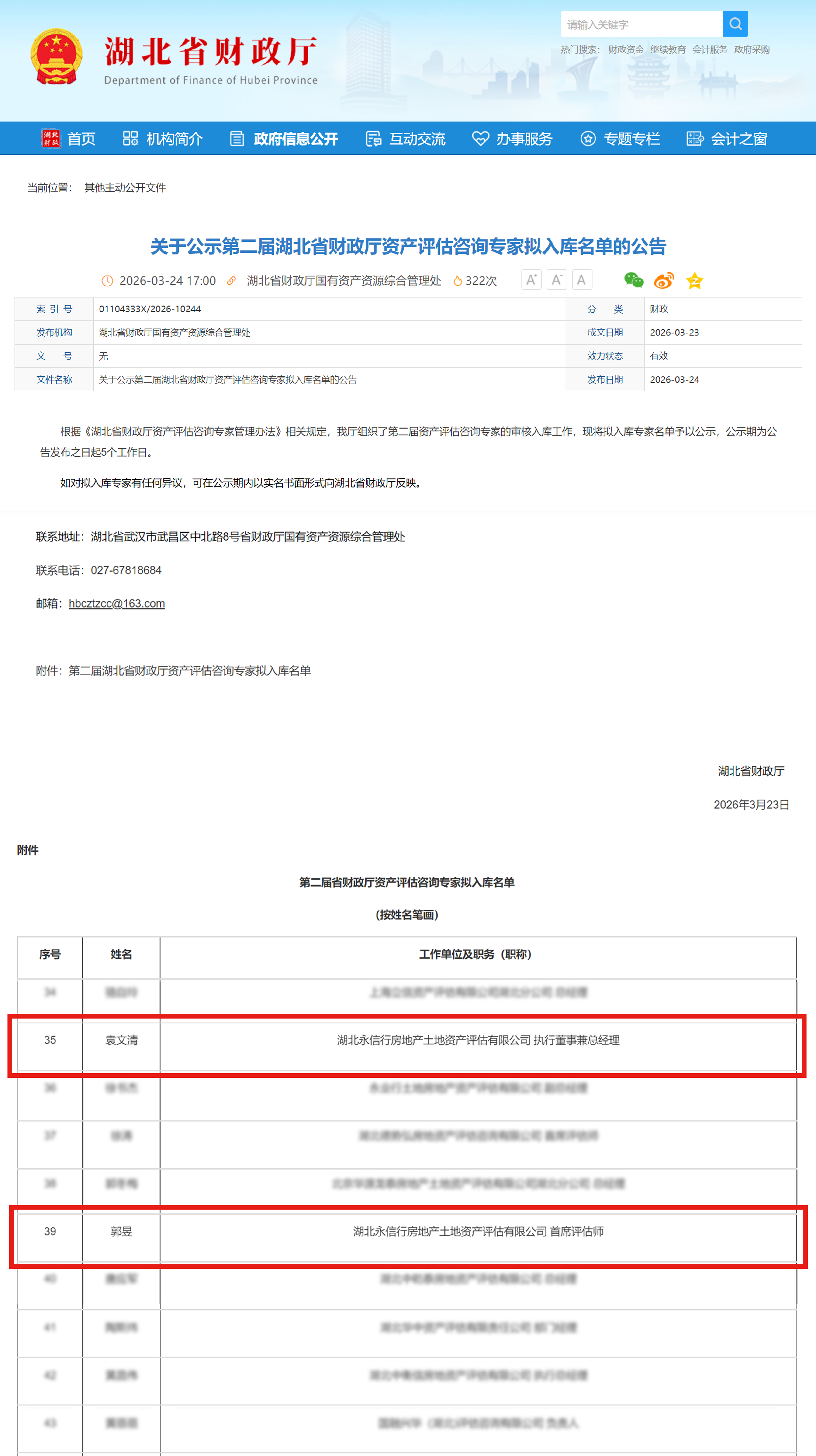 近日,湖北省财政厅经层层严格筛选与审慎评定,正式公示第二届资产评估咨询专家拟聘名单,永信行袁文清、郭昱名列其中。