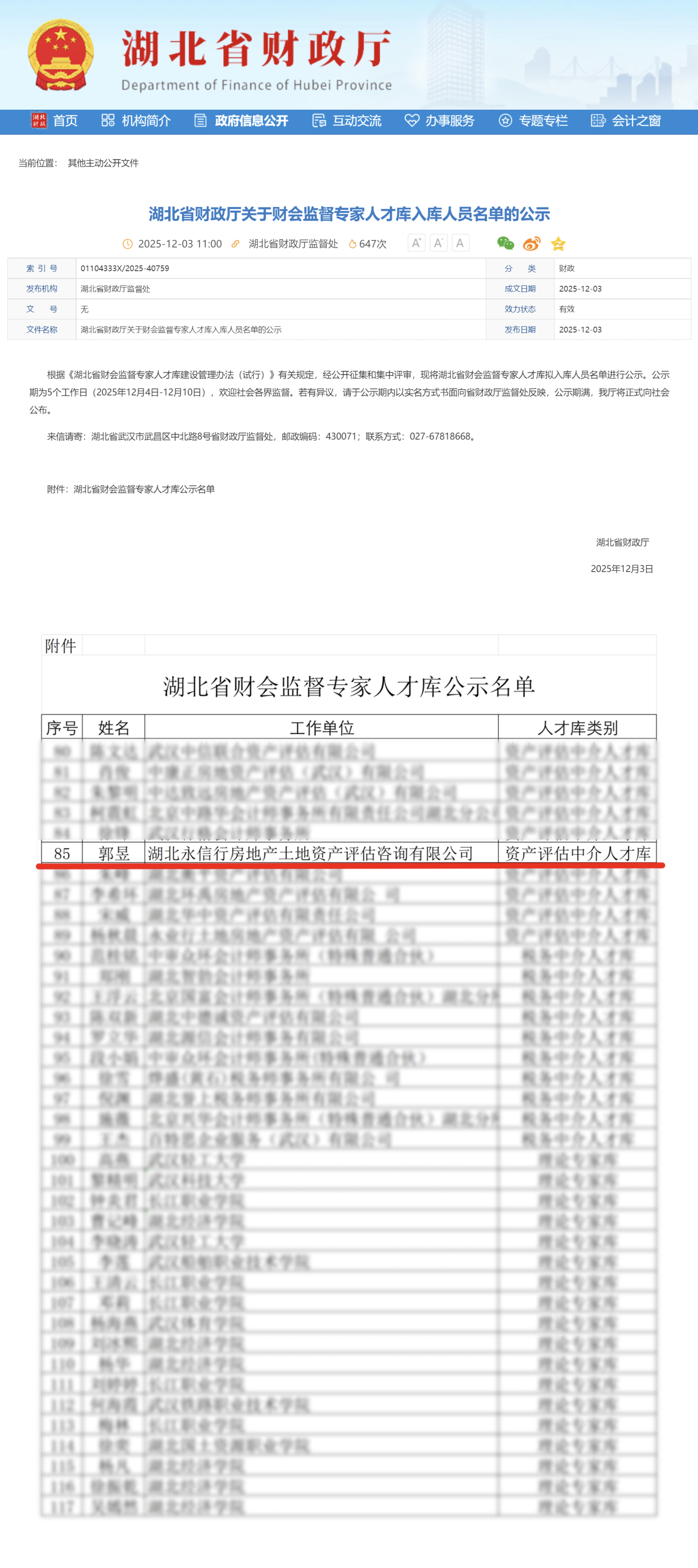 同时,在湖北省财政厅最新公示的财会监督专家人才库入库名单中,永信行资产评估事业总监郭昱成功入选“资产评估中介人才库”。该人才库经公开征集与集中评审产生,将为全省财会监督工作提供专业智库支持,郭昱总监的入库彰显了其在资产评估领域的专业能力和行业担当。