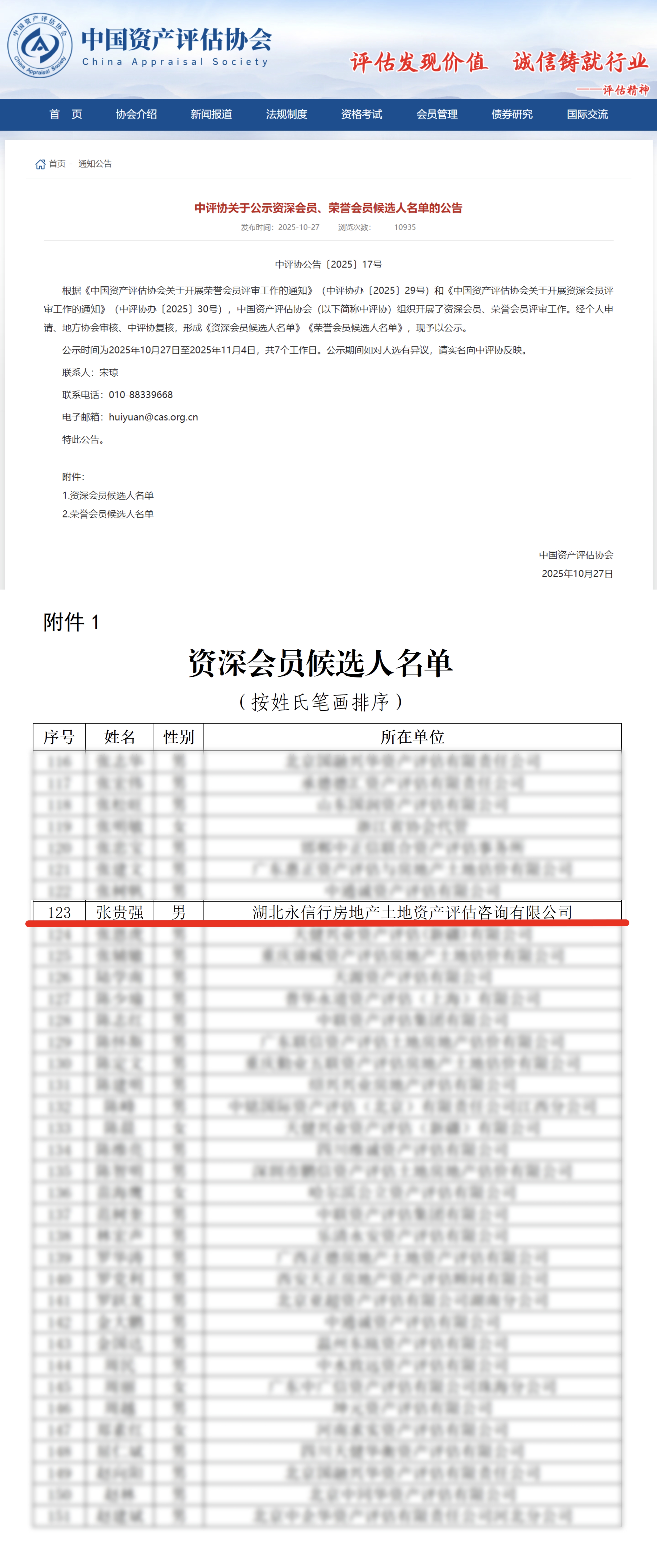 此外,中国资产评估协会公示了2025年资深会员候选人名单,永信行评估技术总监张贵强荣誉入选。该评审经过个人申请、地方协会审核及中评协复核等多道程序,旨在表彰长期为资产评估行业做出显著贡献的专业人士,张贵强总监的入选是对其专业技术与行业贡献的高度认可。